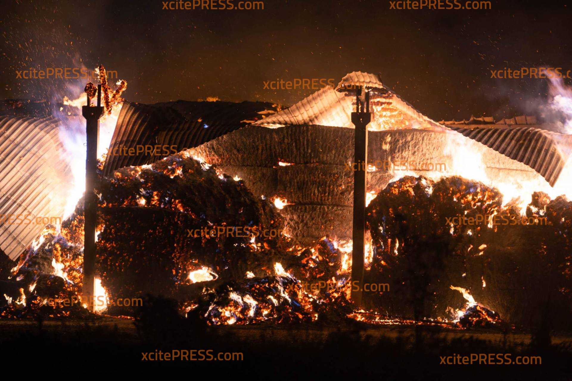 Beim Eintreffen von Feuerwehr und Polizei stand das Gebäude in der Größe von etwa 22 mal 120 Meter bereits im Vollbrand. Die Kameraden evakuierten gemeinsam mit Mitarbeitern der Firma sowie der Polizei etwa 200 bis 250 Kälber und Schweine aus dem Stall und brachten sie auf einer angrenzenden Koppel unter. Da das Gebäude auch als Getreide- und Mineralstofflager genutzt wird, befanden sich größere Mengen an Heu- und Strohballen in der Halle.