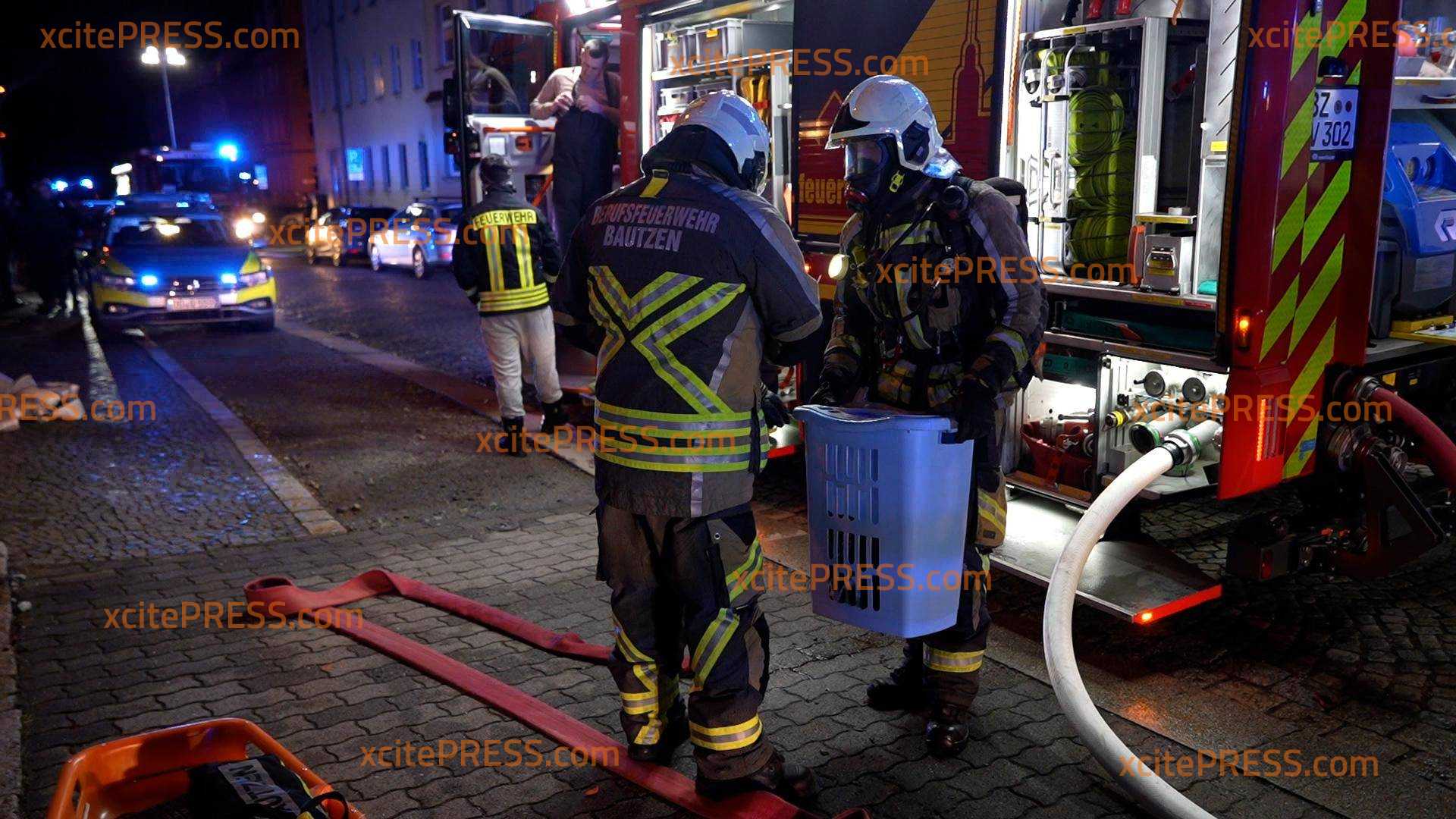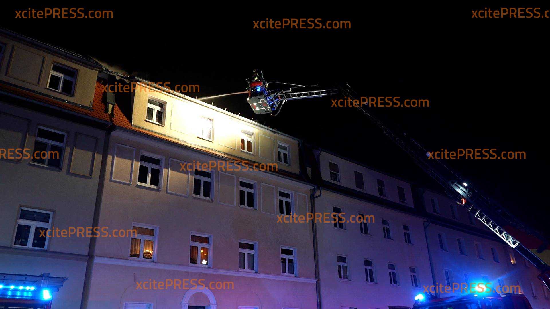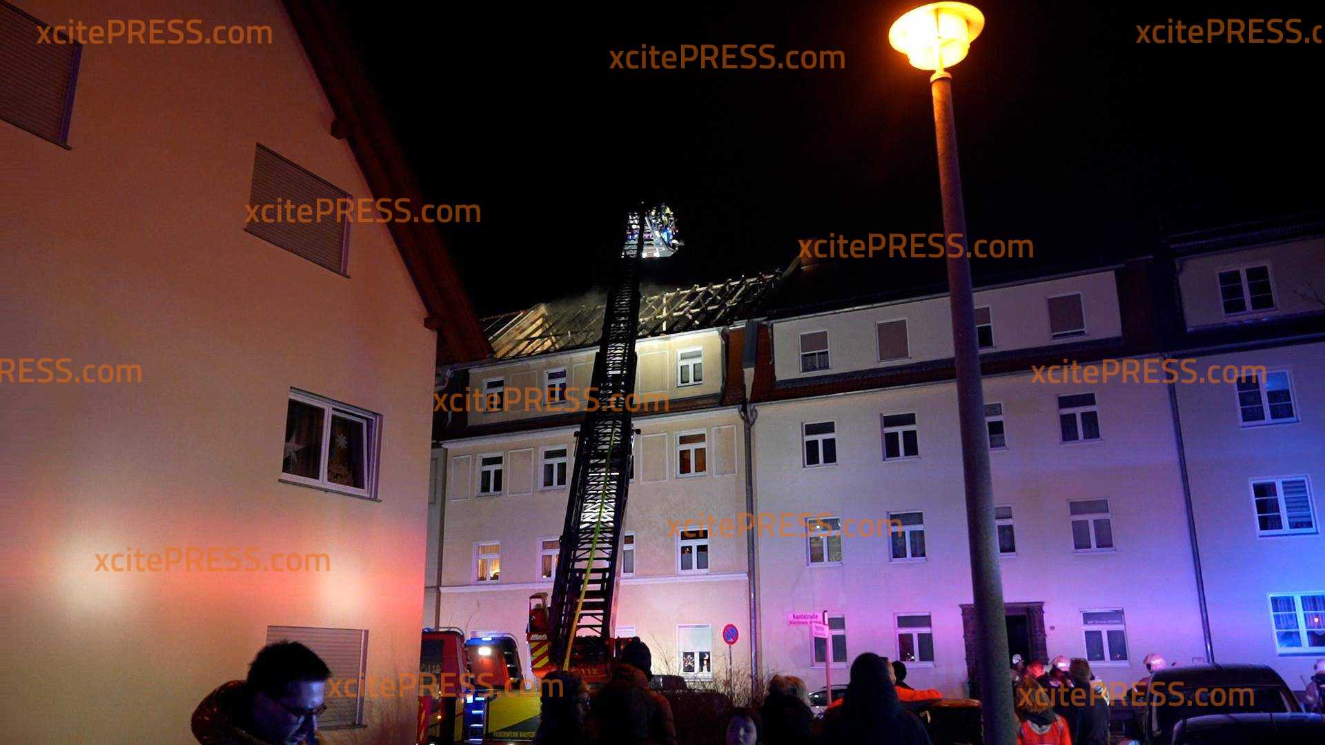 Ein Dachstuhlbrand hat in der Nacht zu Dienstag ein Wohnhaus auf der Bautzener Kantstraße zerstört. Das Feuer war gegen 21:45 Uhr ausgebrochen und hatte sich durch den starken Wind rasend schnell auf das gesamte Dach des Mehrfamilienhauses ausgebreitet. Als die Feuerwehr eintraf brannte das Dach des Hauses lichterloh. Sofort begann man damit, die Bewohner zu evakuieren und Löschmaßnahmen einzuleiten. Außerdem wurde das Alarmstichwort erhöht, sodass weitere Feuerwehren hinzugezogen wurden. Unter dem Stichwort "Großbrand" waren über 80 Einsatzkräfte von Feuerwehr, Rettungsdienst und Polizei im Einsatz, um den Brand zu löschen und angrenzende Häuser zu schützen. Dank des schnellen Einsatzes der Feuerwehrleute konnten die beiden angrenzenden Häuser gehalten werden, das Feuer griff nicht über. Jedoch ist das Haus, in welchem der Brand ausbrach, vorerst unbewohnbar. Die Bewohner wurden vorrübergehend in einem Zelt der Schnelleinsatzgruppe des ASB Bautzen untergebracht, während man mit Hotels Ersatzunterkünfte abklärte. In der Zwischenzeit hatten Feuerwehrleute zudem mehrere Katzen aus der Brandwohnung gerettet. Sie wurden in einem Wäschekorb ins Freie gebracht und anschließend den überglücklichen Eigentümern übergeben. Warum der Brand ausbrach, ist noch nicht bekannt. Die Polizei ermittelt.