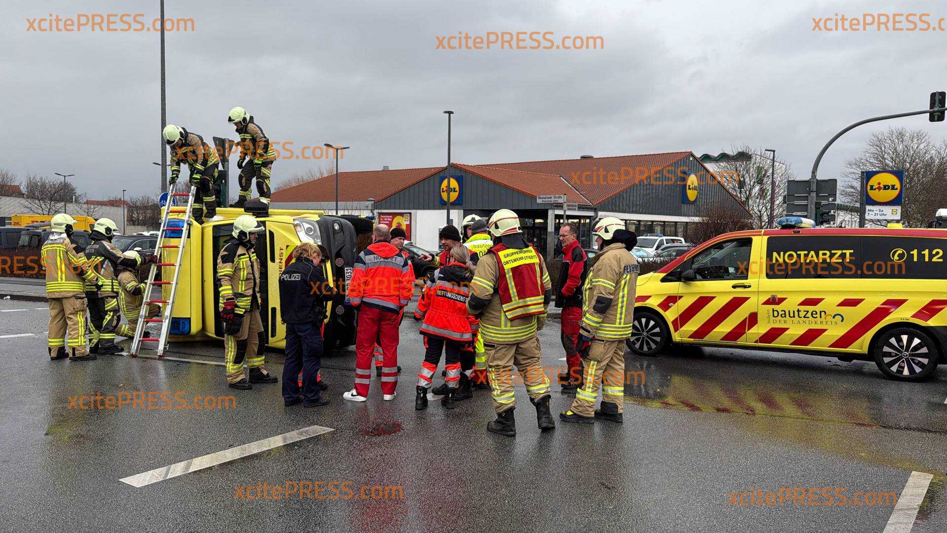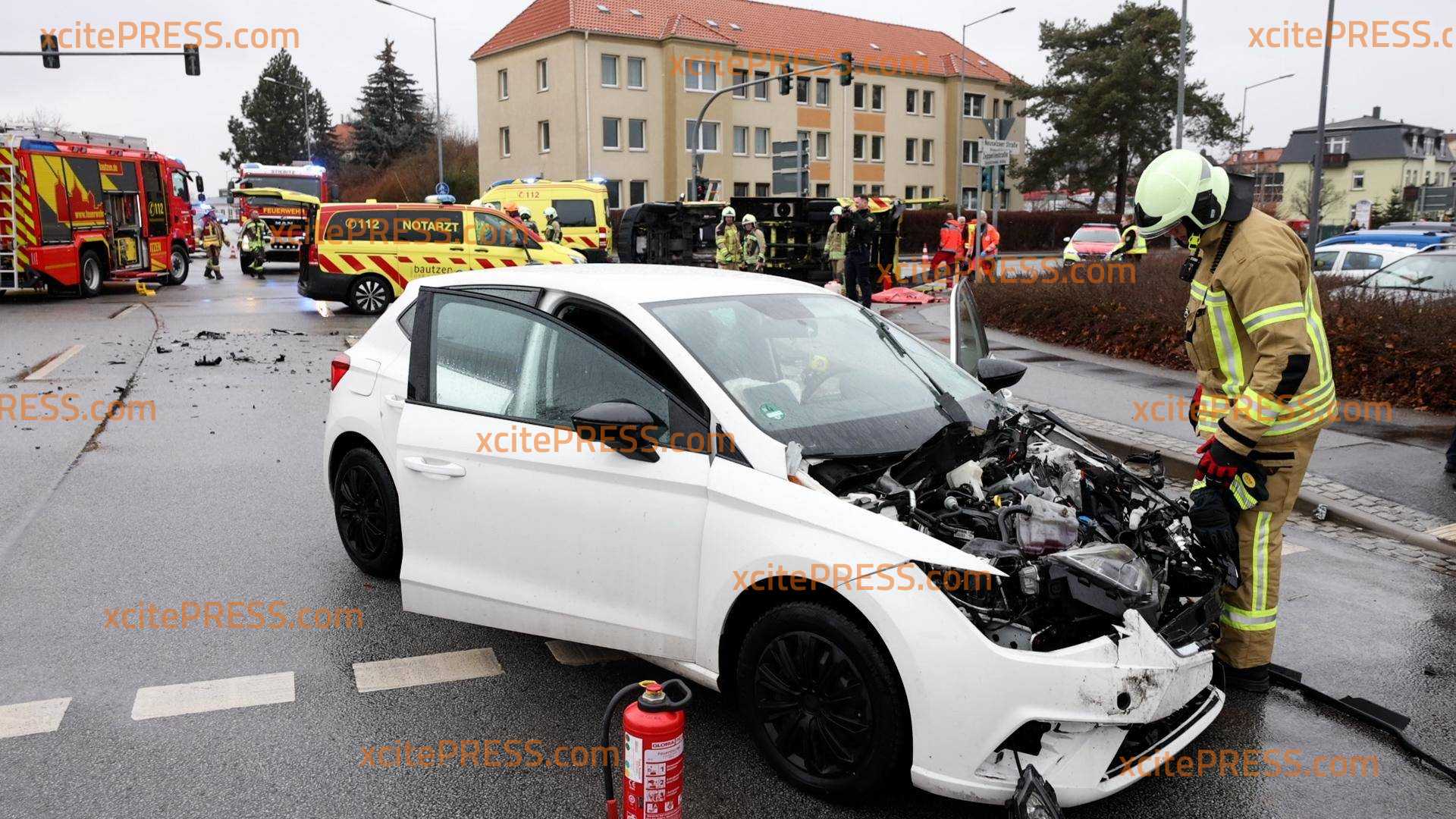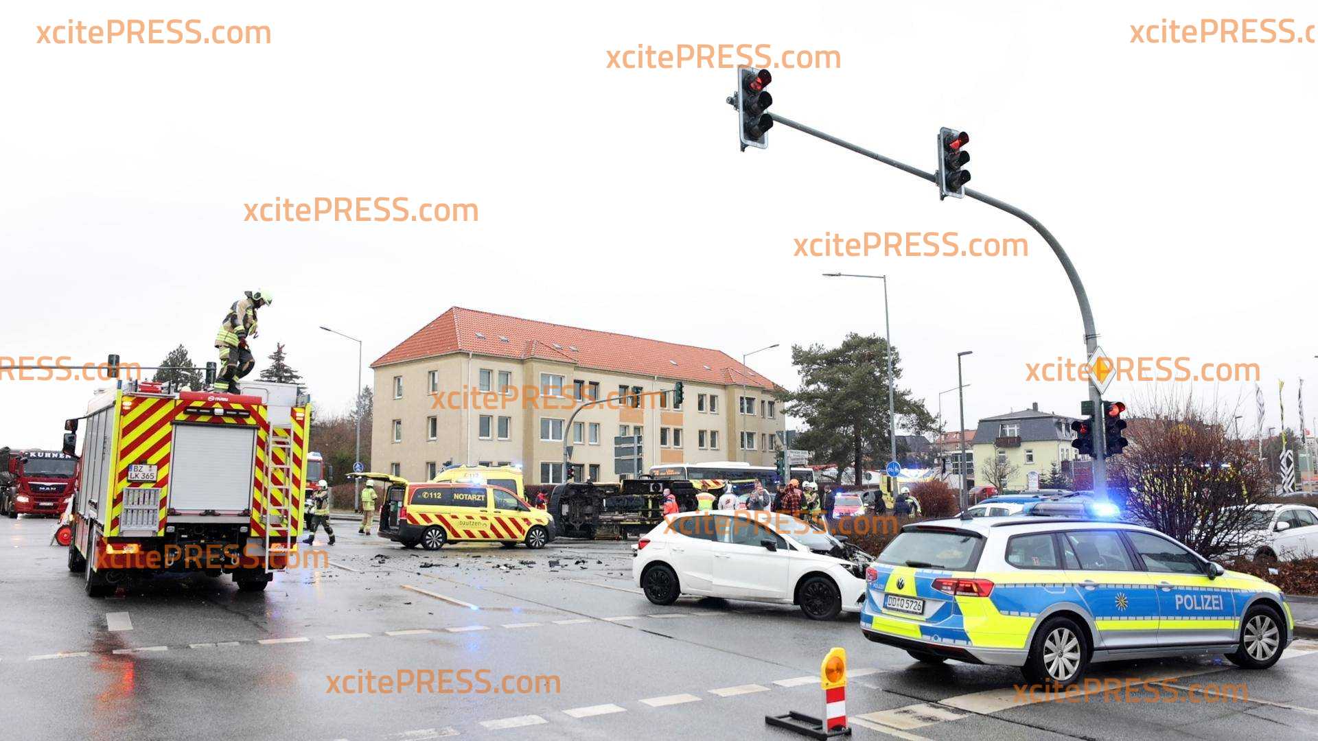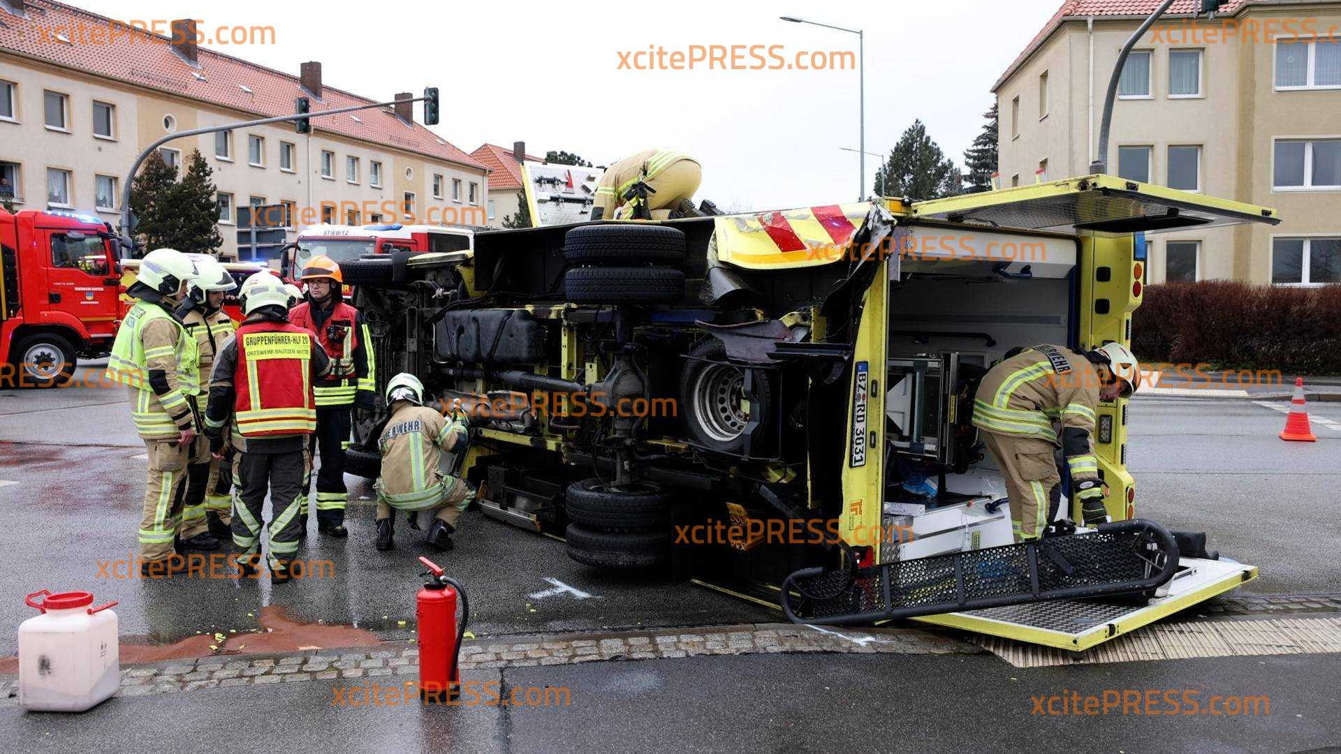 Am Donnerstagnachmittag eilten Feuerwehr, Polizei und Rettungsdienst zu einem Verkehrsunfall auf die Neusalzer Straße in Bautzen. Dort brauchten eigene Kollegen Hilfe. Gegen 13:00 Uhr ereignete sich im Kreuzungsbereich Zeppelinstraße - Neusalzer Straße ein Unfall, der so heftig war, dass ein Rettungswagen, der sich Ersten Erkenntnissen nach auf Einsatzfahrt befunden hat, in Folge des Unfalls umkippte und auf der Straße liegenblieb. Ersten Recherchen zufolge wurden bei dem Unfall, bei welchen 5 Personen betroffen sind, 3 verletzt.