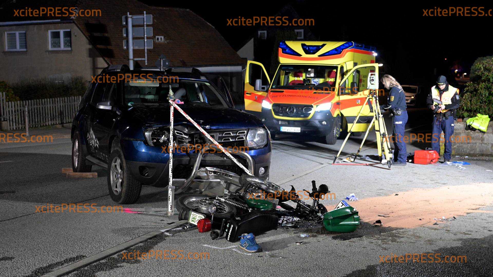 Bei einem schweren Verkehrsunfall am späten Freitagabend wurden zwei Teenager schwer verletzt. Es war kurz nach 21:00 Uhr, als sich der Unfall in der Gemeinde Kottmar im Ortsteil Neueibau ereignete. Ersten Erkenntnissen nach befuhr die 51- jährige Fahrerin eines Dacia die Hauptstraße aus Leutersdorf kommend in Richtung Neugersdorf. In Höhe des Postwegs beabsichtigte sie nach links abzubiegen und übersah dabei offenbar das entgegenkommende Moped S51 mit den zwei Jugendlichen im Alter von 16 (Sozius/männlich) und 17 (Fahrer/männlich) Jahren. Es kam zum folgenschweren Zusammenstoß beider Fahrzeuge, bei dem die beiden Jugendlichen schwer verletzt wurden. Einer der beiden Teenager wurde durch den Unfall offensichtlich so schwer verletzt, dass er vor Ort reanimiert werden musste. Erst etwa eine Stunde nach dem Unfall konnte er mit einem Rettungshubschrauber in eine Dresdener Klinik geflogen werden. Ein Kriseninterventionsteam kam zum Einsatz. Feuerwehren aus Neueibau und Walddorf waren neben dem Rettungsdienst mit drei Rettungswagen, einem Notarzteinsatzfahrzeug, einen Rettungshubschrauber und der Landespolizei im Einsatz. Für die Unfallaufnahme wurde der Verkehrsunfalldienst der Polizeidirektion Görlitz hinzugezogen. Für die Dauer der Rettungsmaßnahmen und der Unfallaufnahme war die Straße in beide Richtungen mehrere Stunden voll gesperrt.