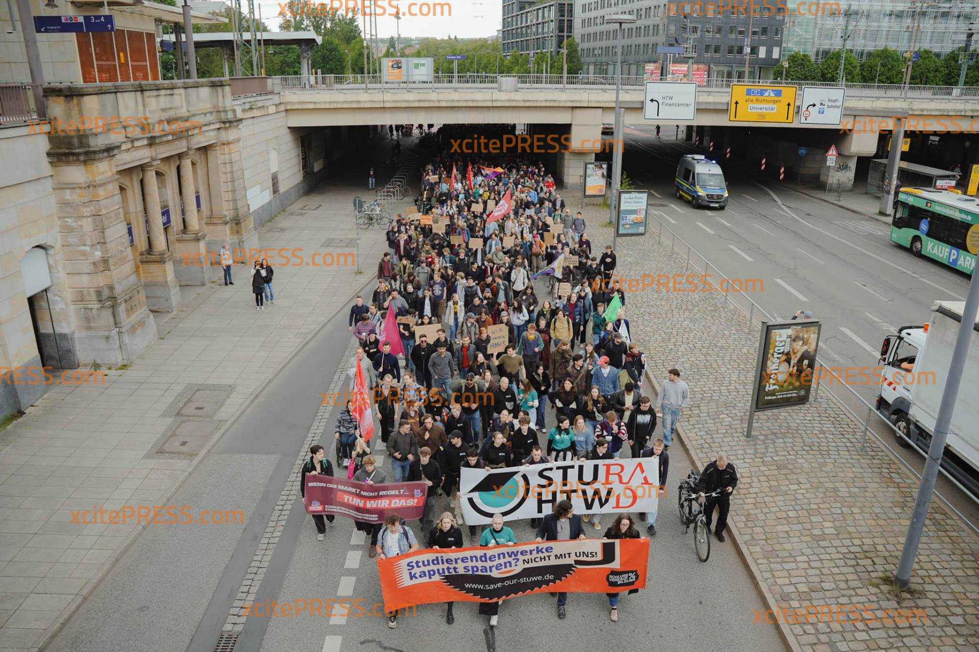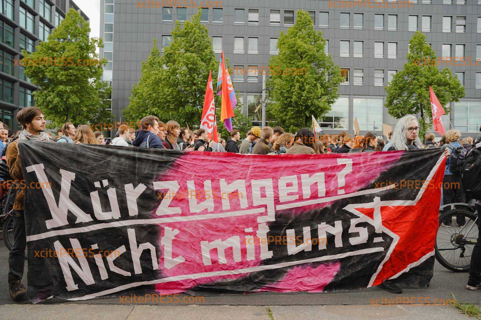 Rund 750 Studenten aus Dresden, Görlitz, Breitenbrunnen und Chemnitz sind in der sächsischen Landeshauptstadt auf der Straße: Dass ihr Semesterbeitrag zu den höchsten in ganz Deutschland gehören könnte, macht sie wütend. Neben steigenden Lebenshaltungskosten und ausbleibenden Bafög-Angleichungen, drohe ab dem nächsten Wintersemester ein Semesterbeitrag von bis zu 370 €.