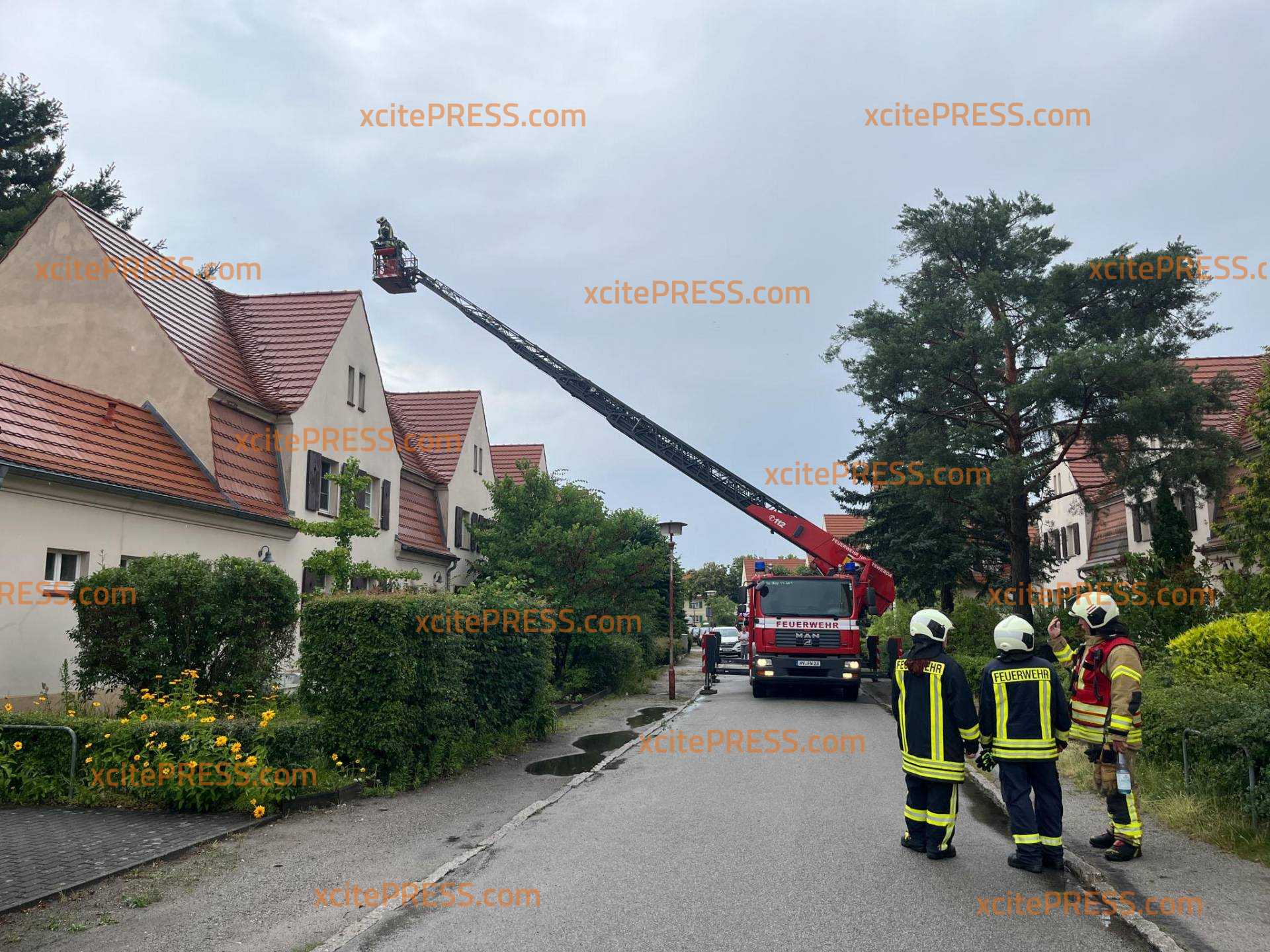 Nach den Löscharbeiten kontrollierten die Einsatzkräfte das Dach mittels Drehleiter auf versteckte Glutnester. Auch die Wohnungen im Gebäude wurden gelüftet, um Rauchgase zu entfernen.