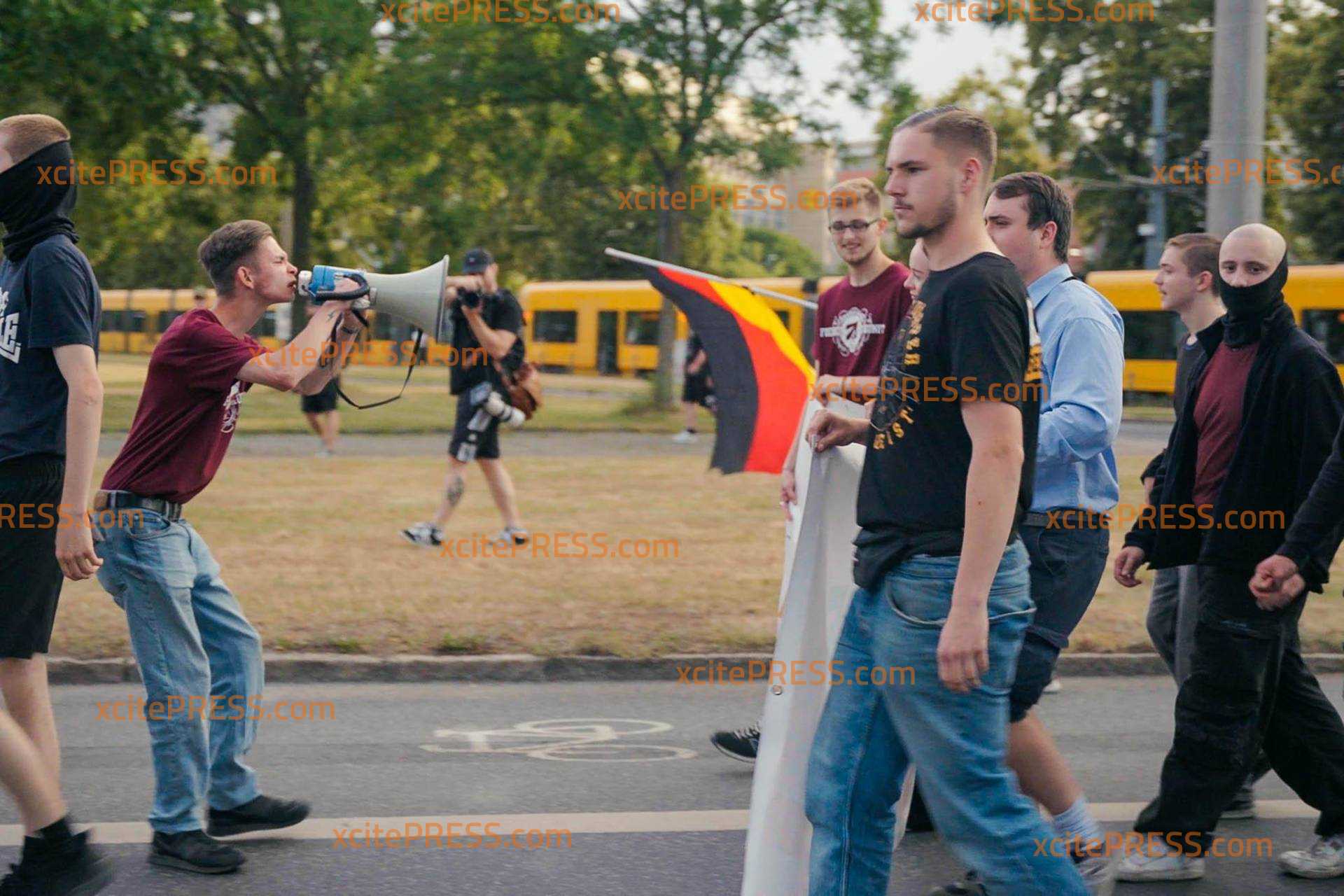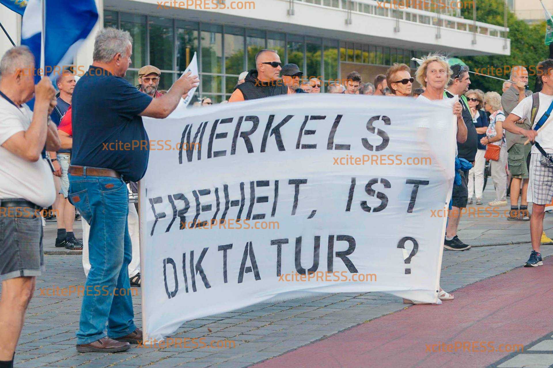 Altkanzlerin Merkel besucht heute die sächsische Landeshauptstadt. Nach einer Autogrammstunde in einer Thalia-Buchhandlung, liest sie im Dresdner Hygienemuseum aus ihrem Buch "Freiheit". Zahlreichen Demonstranten passt das gar nicht: Unter dem Motto "Freiheit ohne Merkel" und "Wir haben nichts vergessen", protestieren Rechte und Rechtsextreme mit zwei Demonstrationen gegen den Merkel-Besuch. Auch einen Block jugendlicher Rechtsextremer ist vertreten. Ein anderer schwenkt eine Sowjet-Fahne. Ein Teilnehmer läuft mit einem Adolf Hitler Tattoo umher: ein dünner "Zensur-Balken" verdeckt das Gesicht nur leicht.