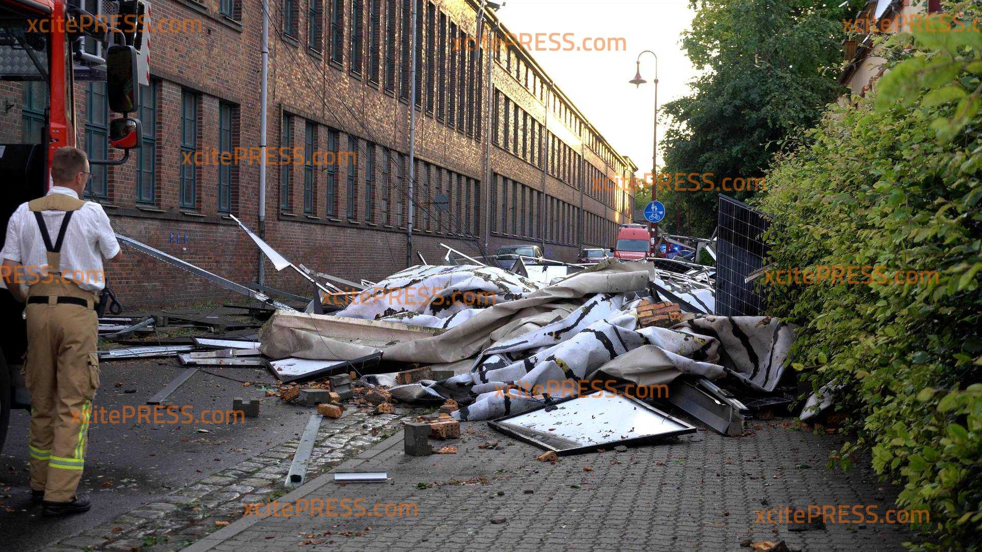 Ein starkes Gewitter hat am heutigen Tag in der Straße der Einheit in Weißwasser zu einem größeren Feuerwehreinsatz geführt. Durch die heftigen Witterungsbedingungen wurde das Dach eines Gebäudes teilweise abgedeckt – betroffen war auch eine darauf installierte Solaranlage.