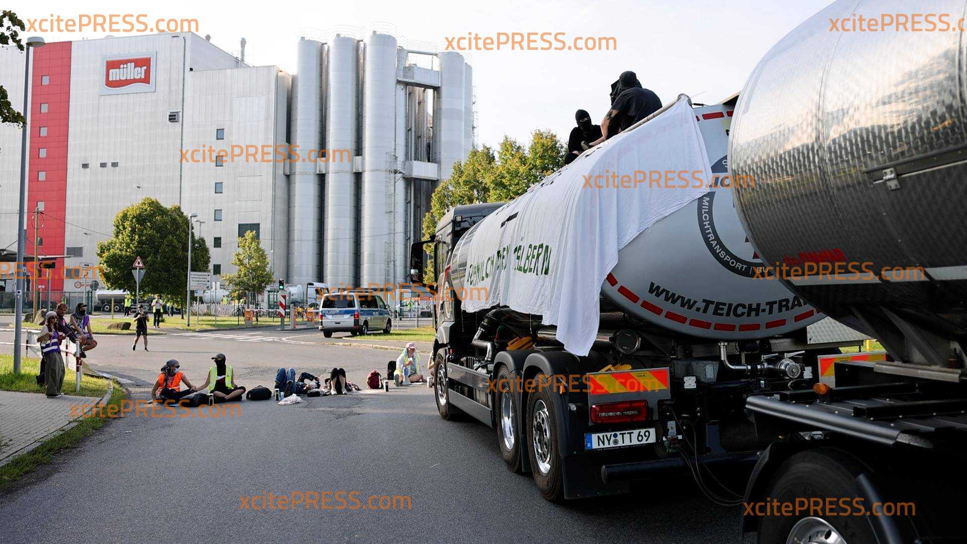 Seit den frühen Morgenstunden blockieren etwa 50 Aktivist:innen die Zufahrtswege zur Molkerei Sachsenmilch im Müllermilch-Werk in Leppersdorf bei Radeberg. Um etwa 5:30 Uhr hatten sich die Demonstrierenden auf der Zufahrtsstraße festgeklebt, sodass weder Lkw noch Beschäftigte das Werksgelände erreichen oder verlassen konnten.
