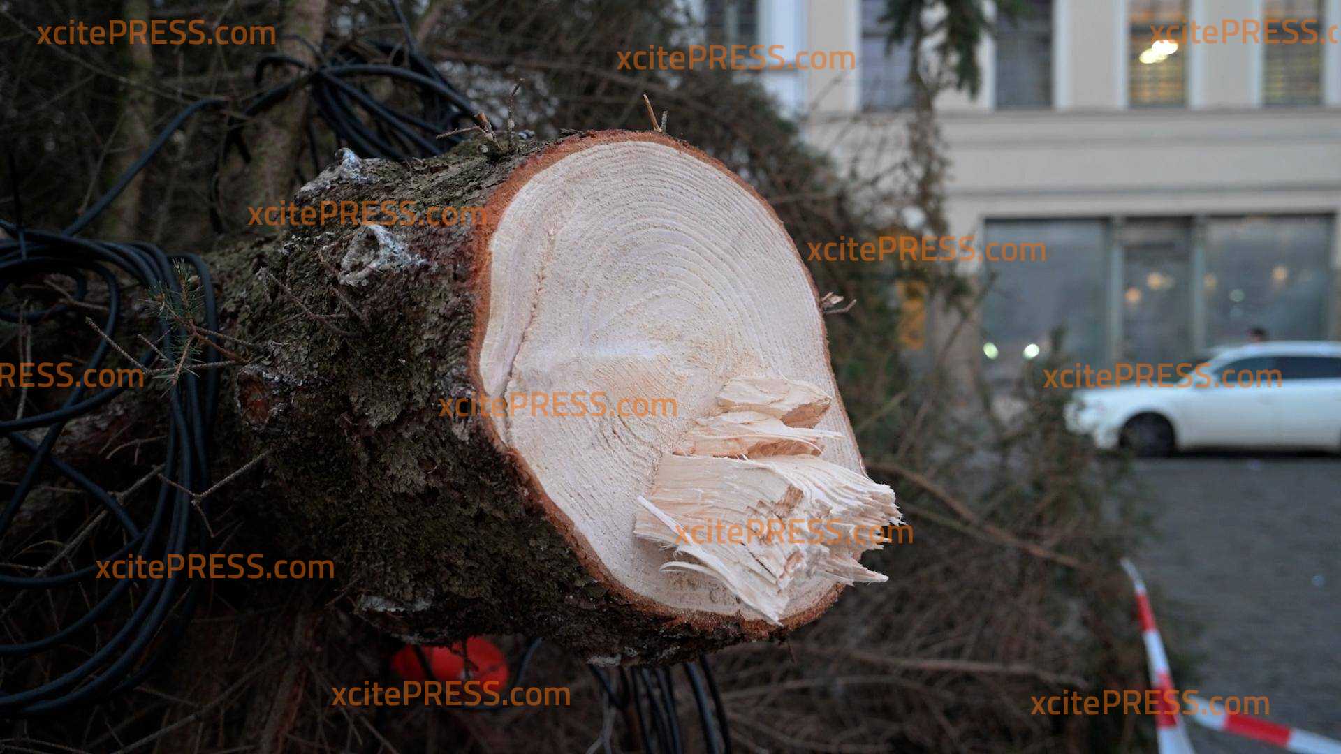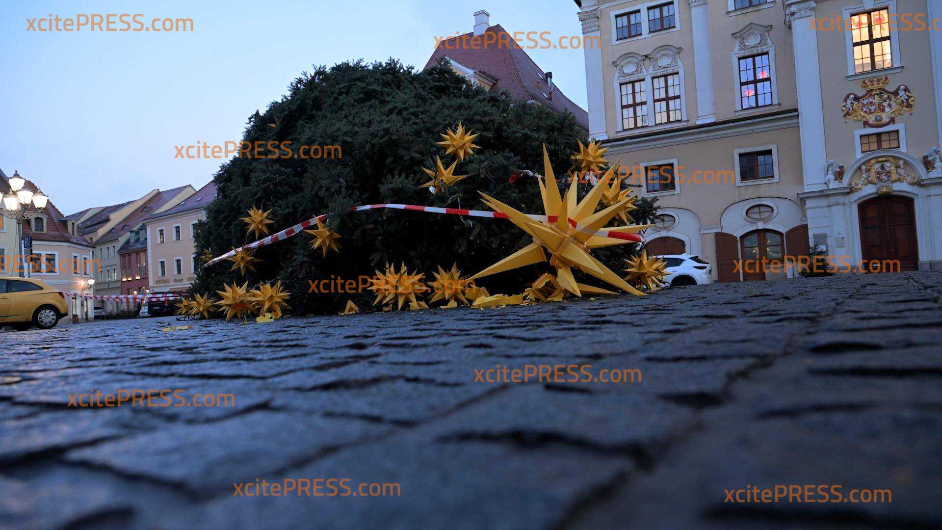Am Morgen bot sich Passanten ein trauriges Bild: Der festlich geschmückte Baum lag samt kompletter Beleuchtung quer über den Altmarkt – von Weihnachtsstimmung keine Spur mehr.