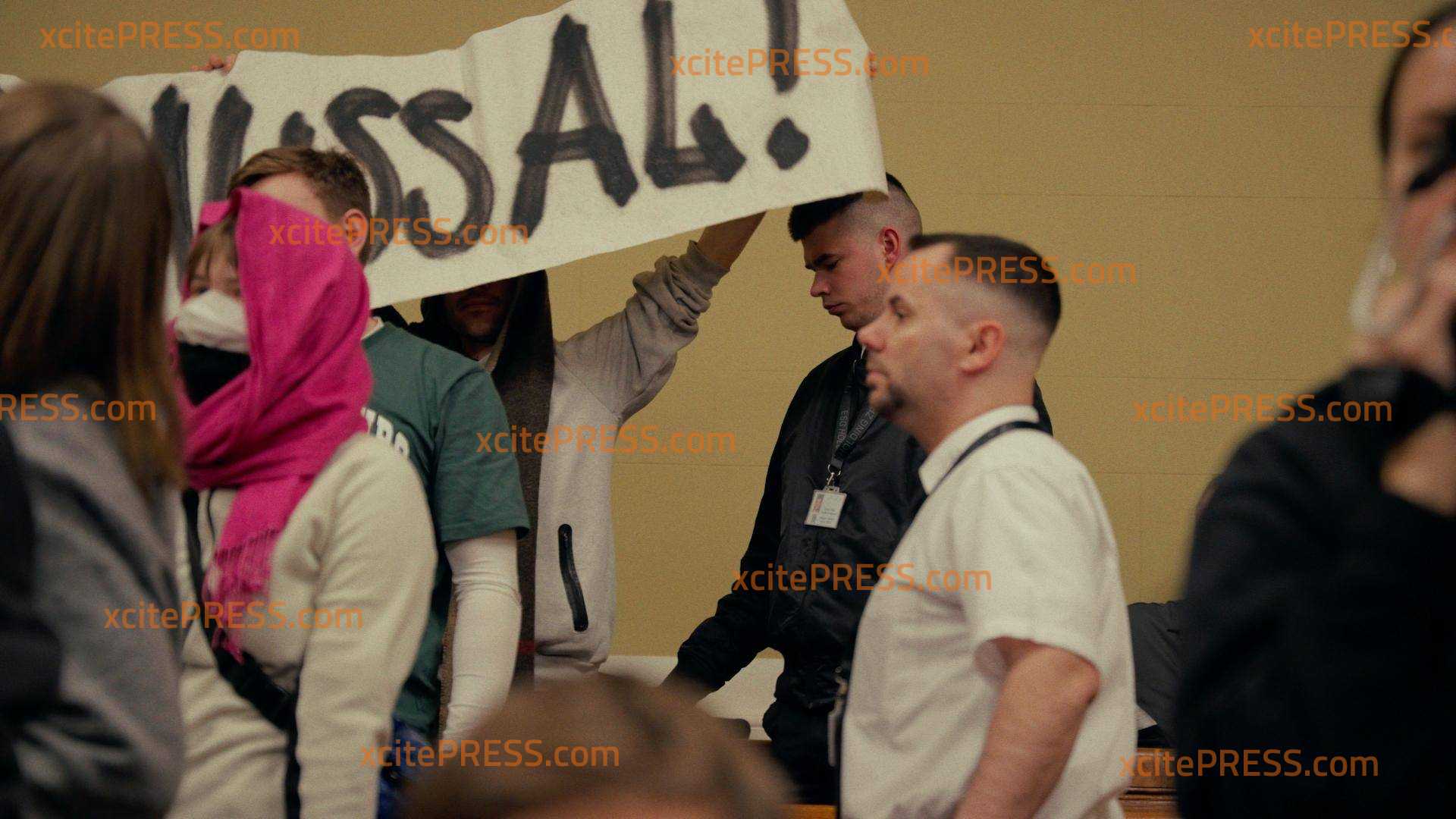 Als T. rausgeführt werden soll, entrollen plötzlich zahlreiche Unterstützer Transparente. Auch bedruckte T-Shirts kommen zum Vorschein. Sicherheitskräfte versuchen die Lage zu beruhigen.