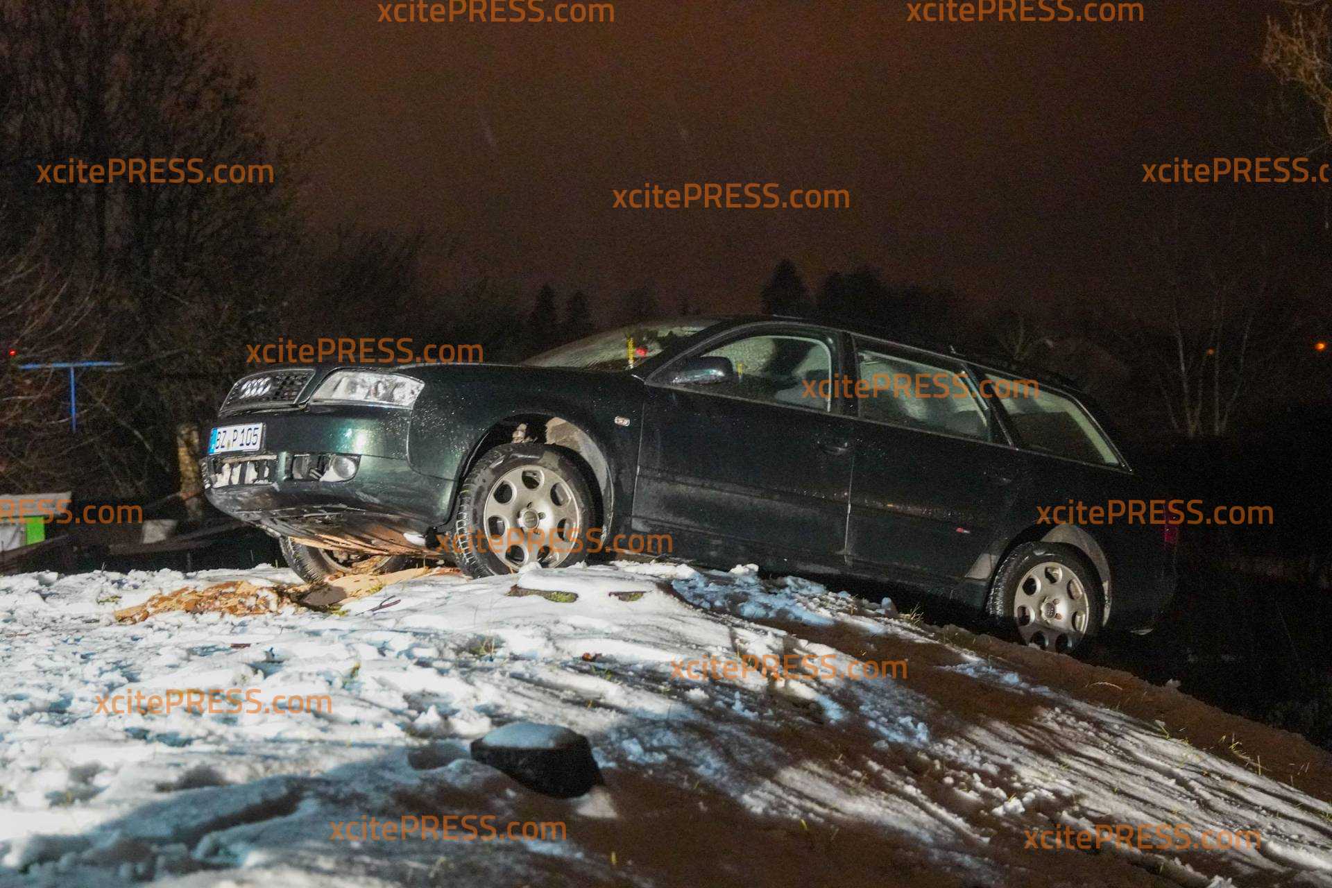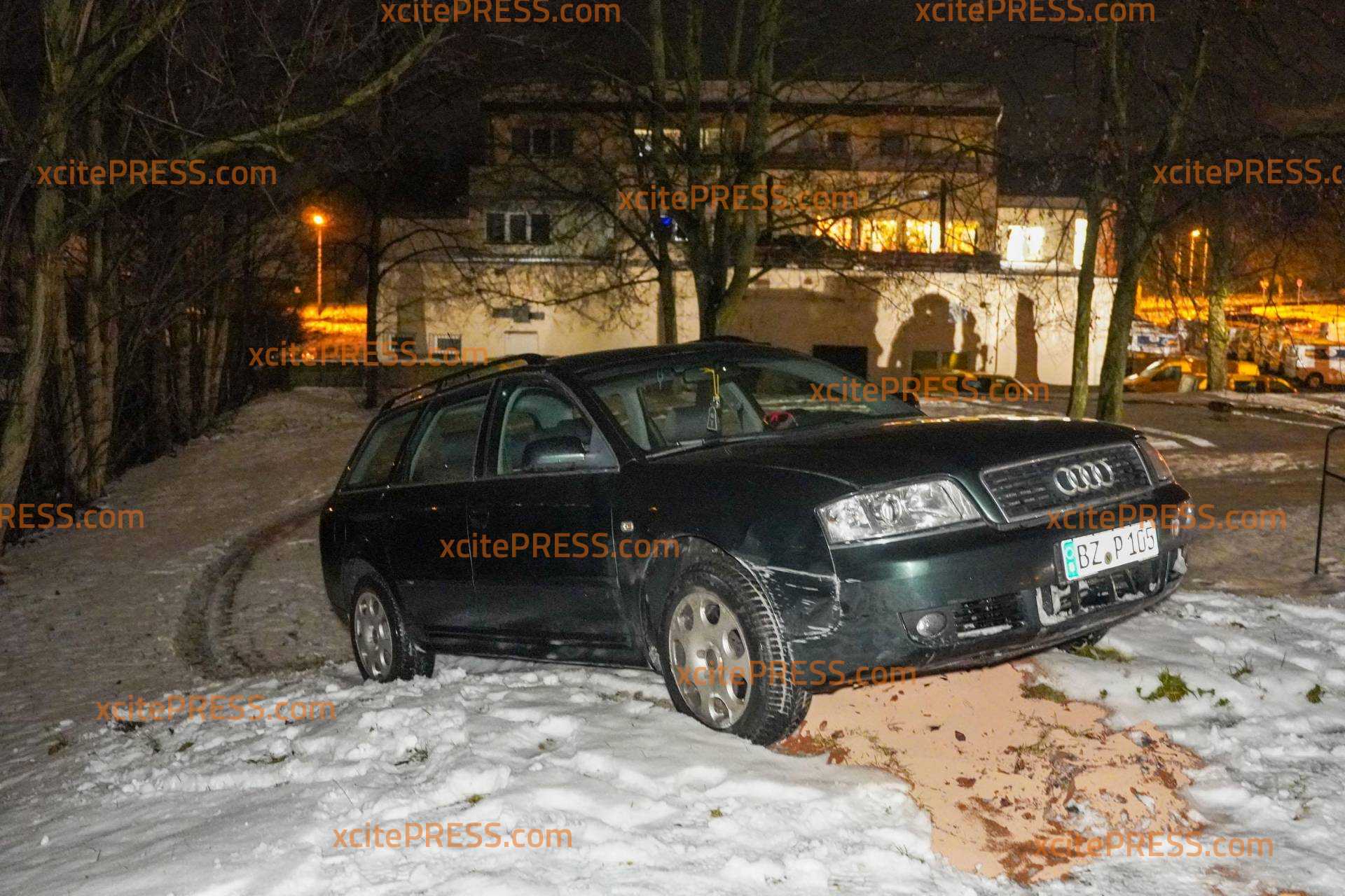 Offenbar in dem Versuch, sich weiter abzusetzen, steuerte der Fahrer anschließend auf einen Abhang zu, um diesen wieder hinaufzufahren. Doch der schneebedeckte Untergrund wurde ihm zum Verhängnis. Beim Versuch, den Hang zu erklimmen, drehten die Räder durch – der Audi verlor an Traktion und blieb schließlich im Schnee stecken. Der Motor heulte noch einmal auf, dann war die Flucht beendet.