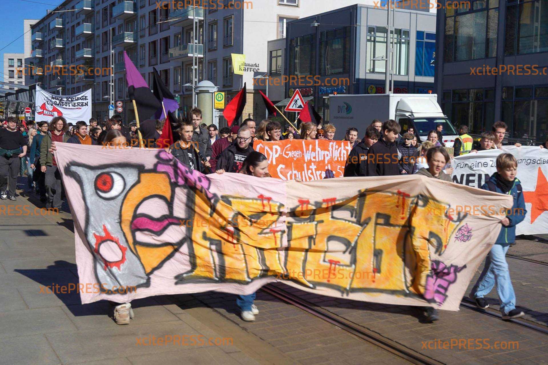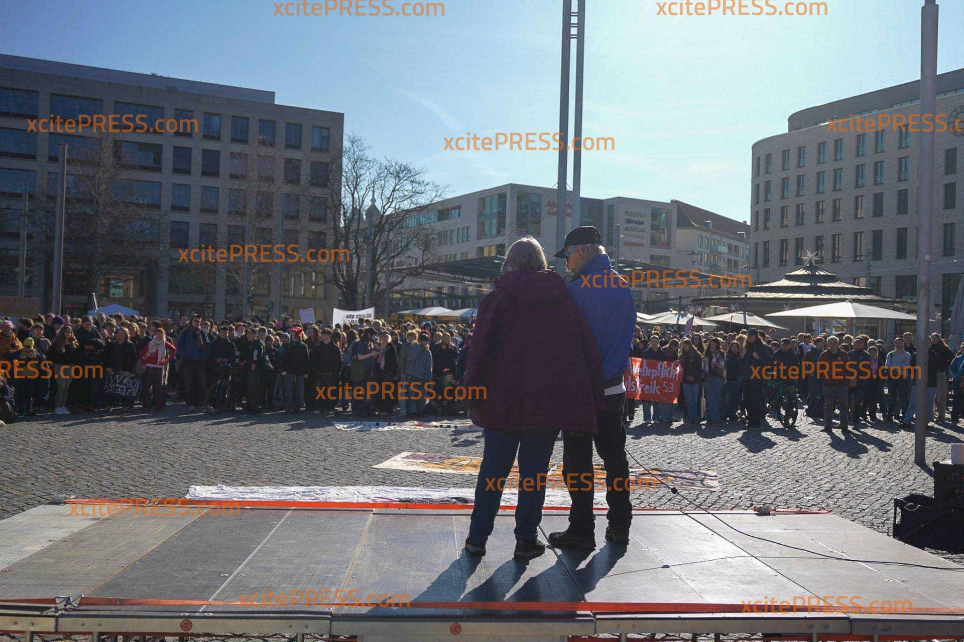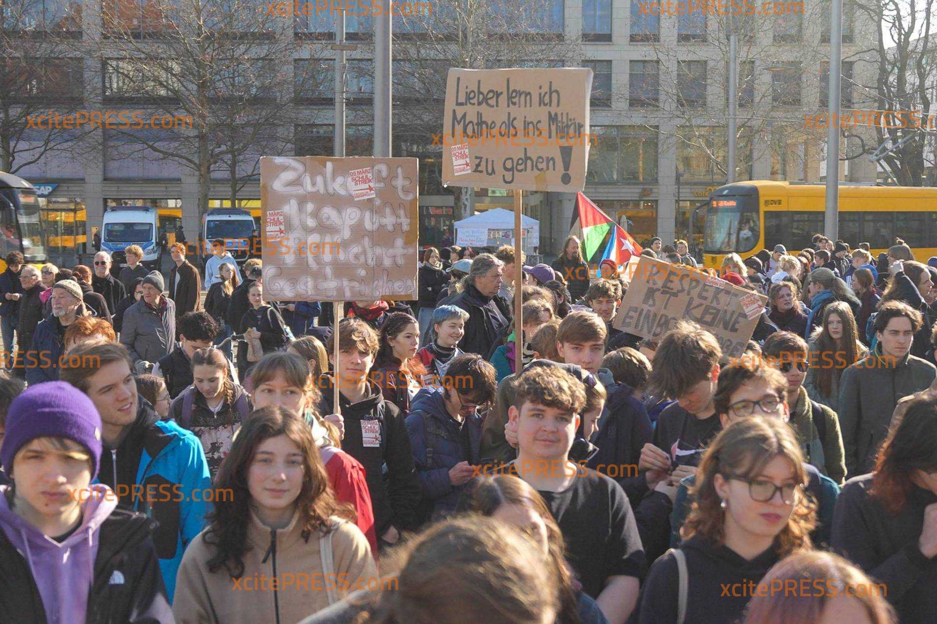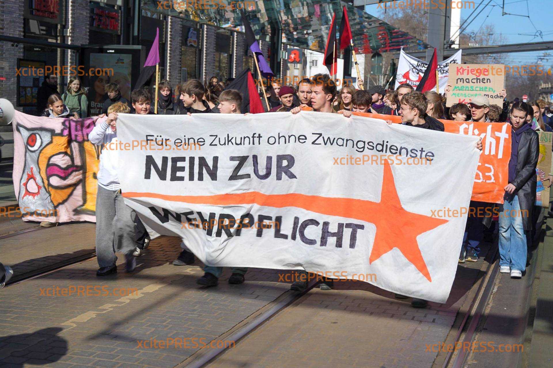 Eigentlich müssten sie jetzt in der Schule sein: In Dresden demonstrieren hunderte Schüler gegen die Wehrdienstpläne der Bundesregierung. Die Kundgebung am Postplatz läuft seit 10 Uhr. Insbesondere der Krieg im Nahen Osten beschäftigt viele junge Menschen. Einige scheinen Sorge zu haben, selbst einmal zur Waffe greifen zu müssen.