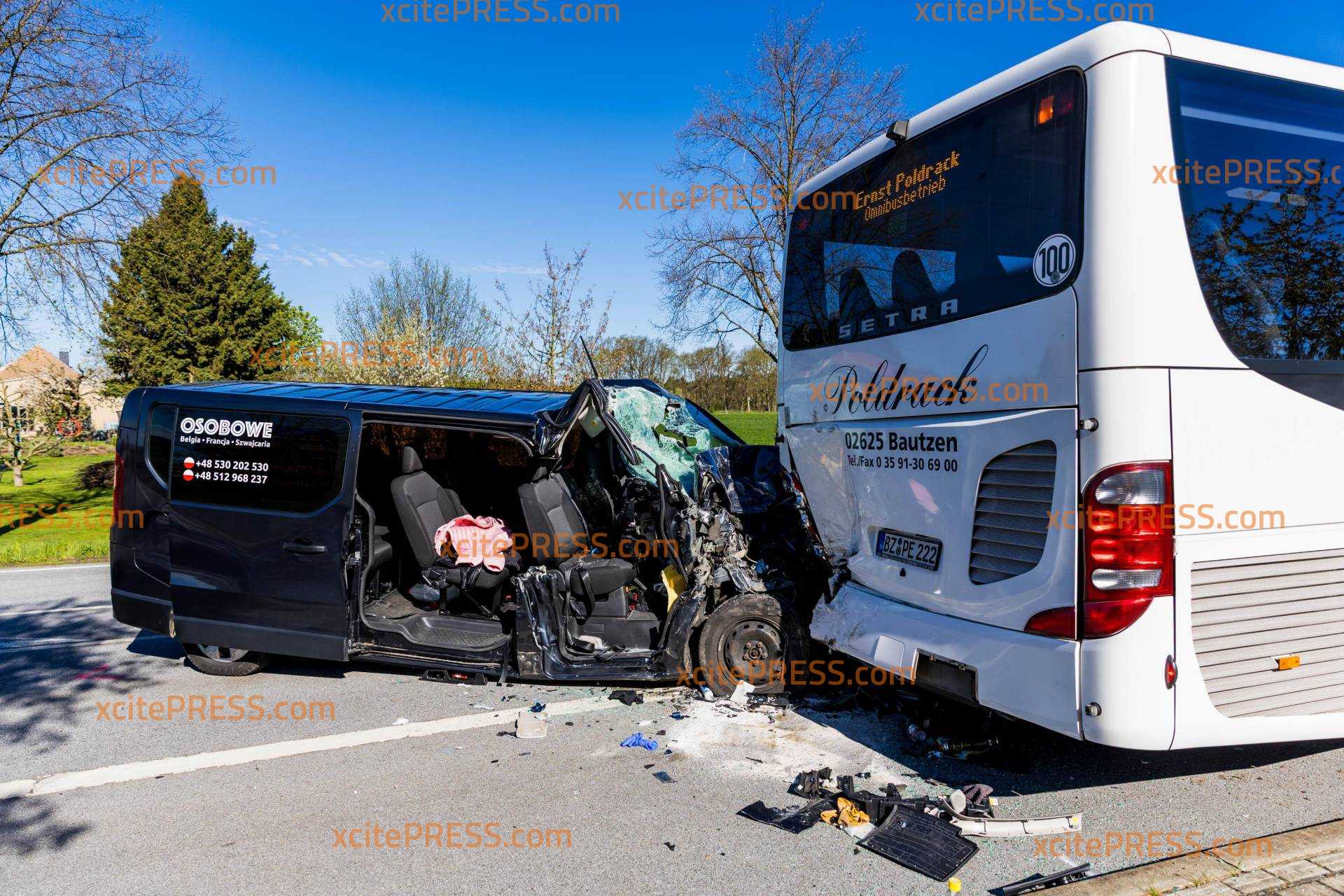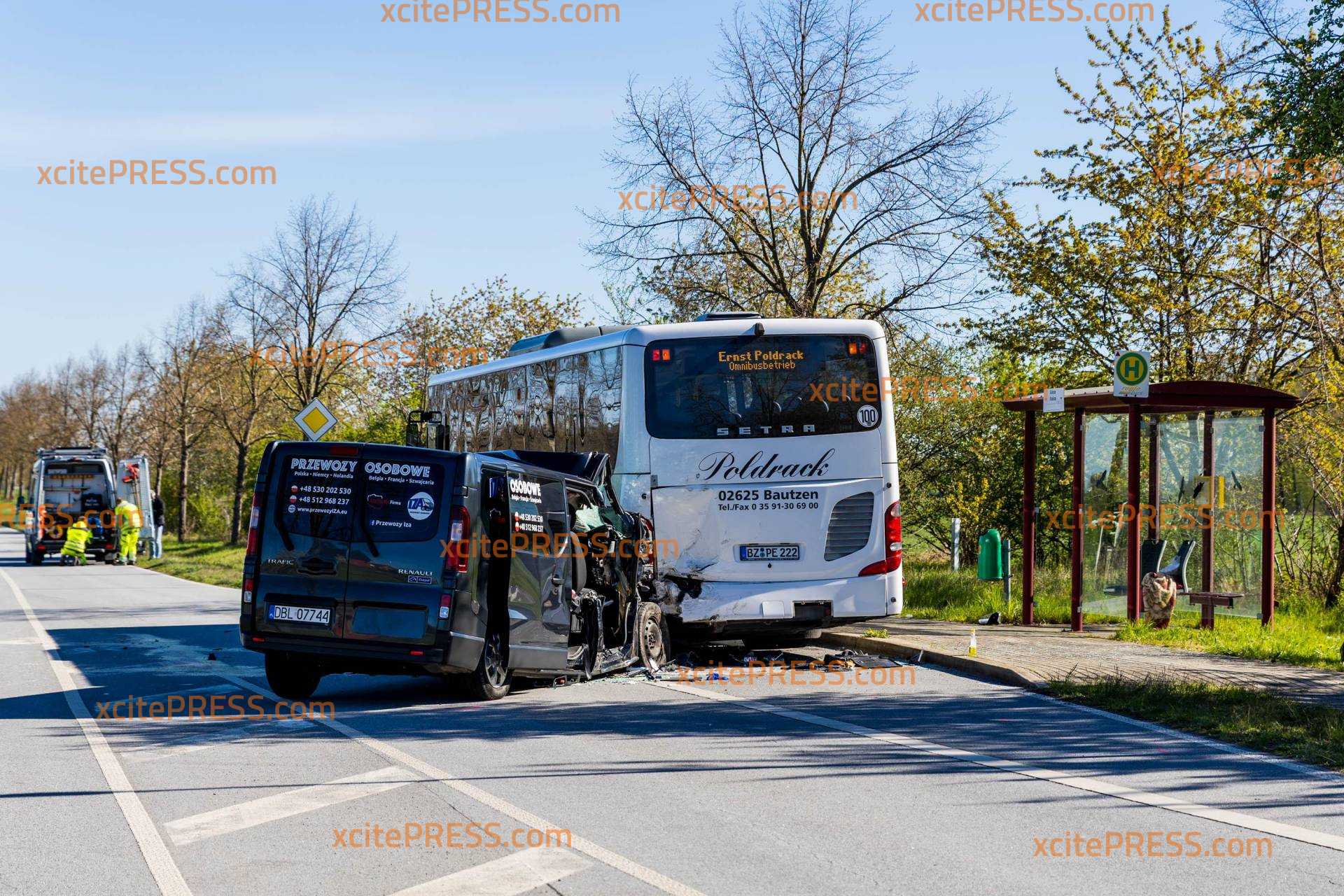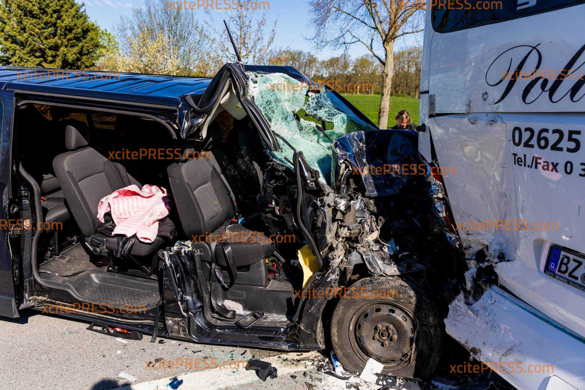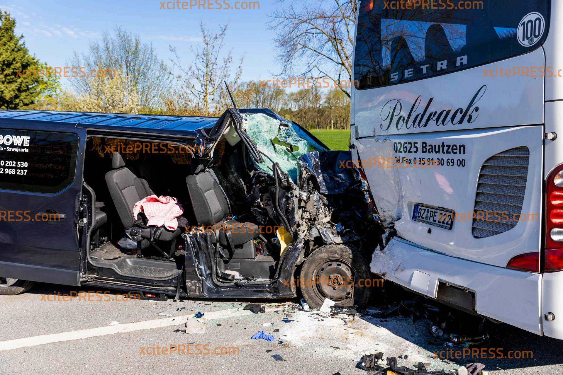 Nach ersten Erkenntnissen war ein polnischer Kleintransporter der Marke Renault auf einen stehenden Linienbus aufgefahren. Durch die Wucht des Aufpralls wurden mehrere Insassen des Transporters verletzt und teilweise im Fahrzeug eingeklemmt.